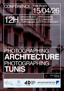 L’Istituto Italiano di Cultura è lieto di invitarvi all’incontro con la fotografa Giovanna Silva e il curatore Filippo Maggia, nell’ambito dell’evento “Fotografare l’architettura. Fotografare Tunisi”, che si terrà il 15 aprile 2026 alle ore 12 presso l’ENAU – Scuola Nazionale di Architettura e Urbanistica di Tunisi (anfiteatro).Questo incontro permetterà di presentare il lavoro della fotografa, […]